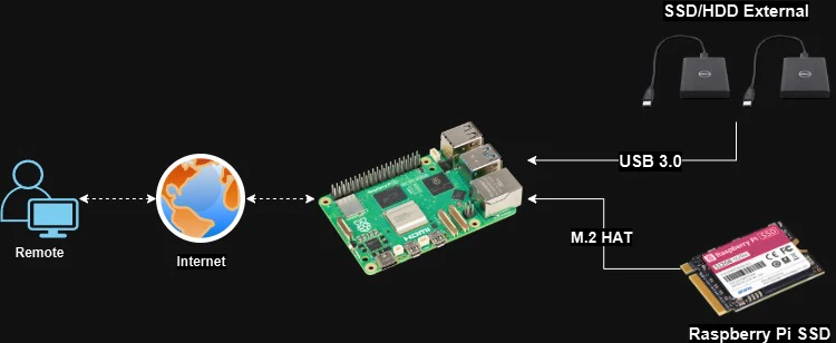 - Cổng M.2 cho NVMe SSD (chỉ Raspberry Pi 5): Với Raspberry Pi 5, bạn có thể kết nối ổ SSD NVMe tốc độ cao trực tiếp thông qua một HAT M.2 cắm vào cổng PCIe. Điều này cho phép bạn xây dựng NAS cực kỳ nhanh, lý tưởng cho việc truyền phát đa phương tiện 4K hoặc các ứng dụng đòi hỏi I/O cao.