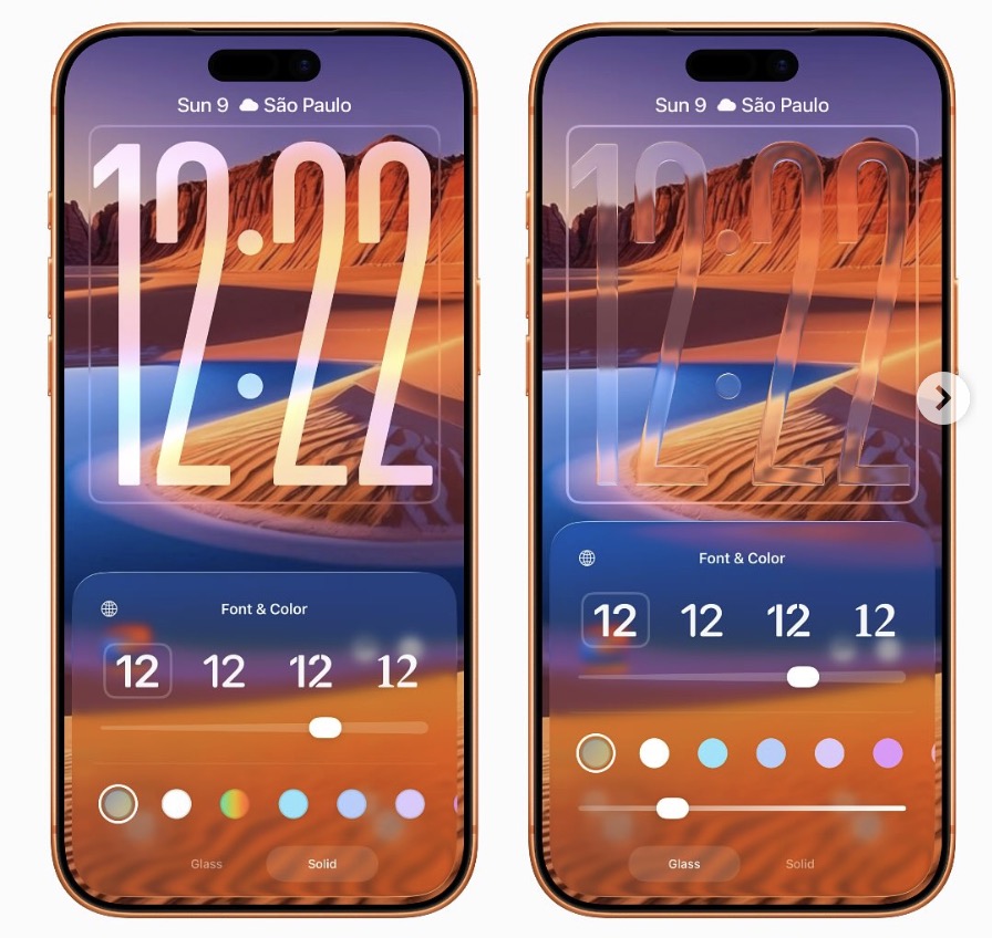 Không chỉ dừng lại ở đó, bạn còn có thể lựa chọn màu sắc, font chữ, và thậm chí là các hiệu ứng đặc biệt như Thủy tinh (Liquid Glass) hoặc dạng Khối (Solid). Những tùy chọn này giúp bạn tạo ra một màn hình khóa không chỉ đẹp mắt mà còn phản ánh phong cách và sở thích cá nhân.